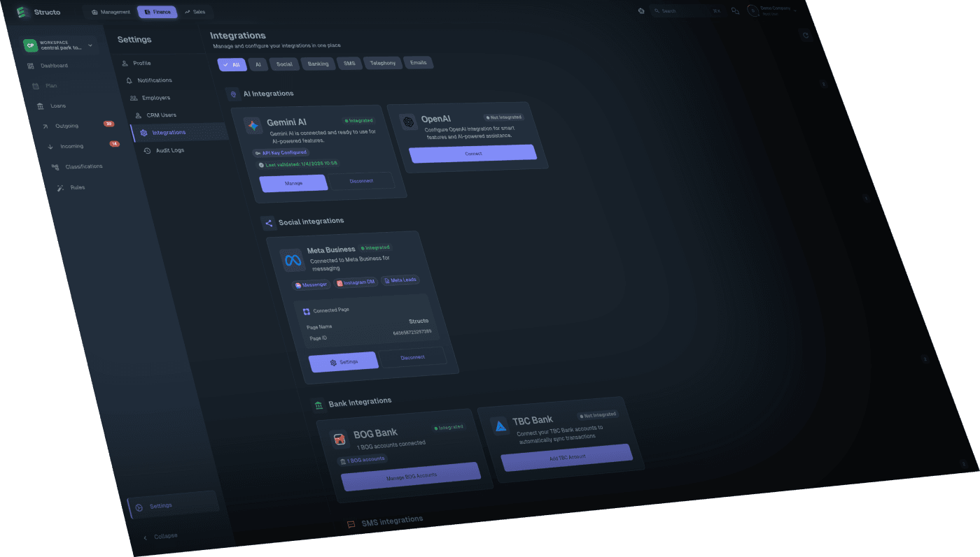 "A client transfers 5,000 GEL via TBC Bank. The system automatically identifies the Contract ID and allocates the funds. This instantly updates the Cashflow, Sales Reporting, and Total Revenue figures—zero manual work required."