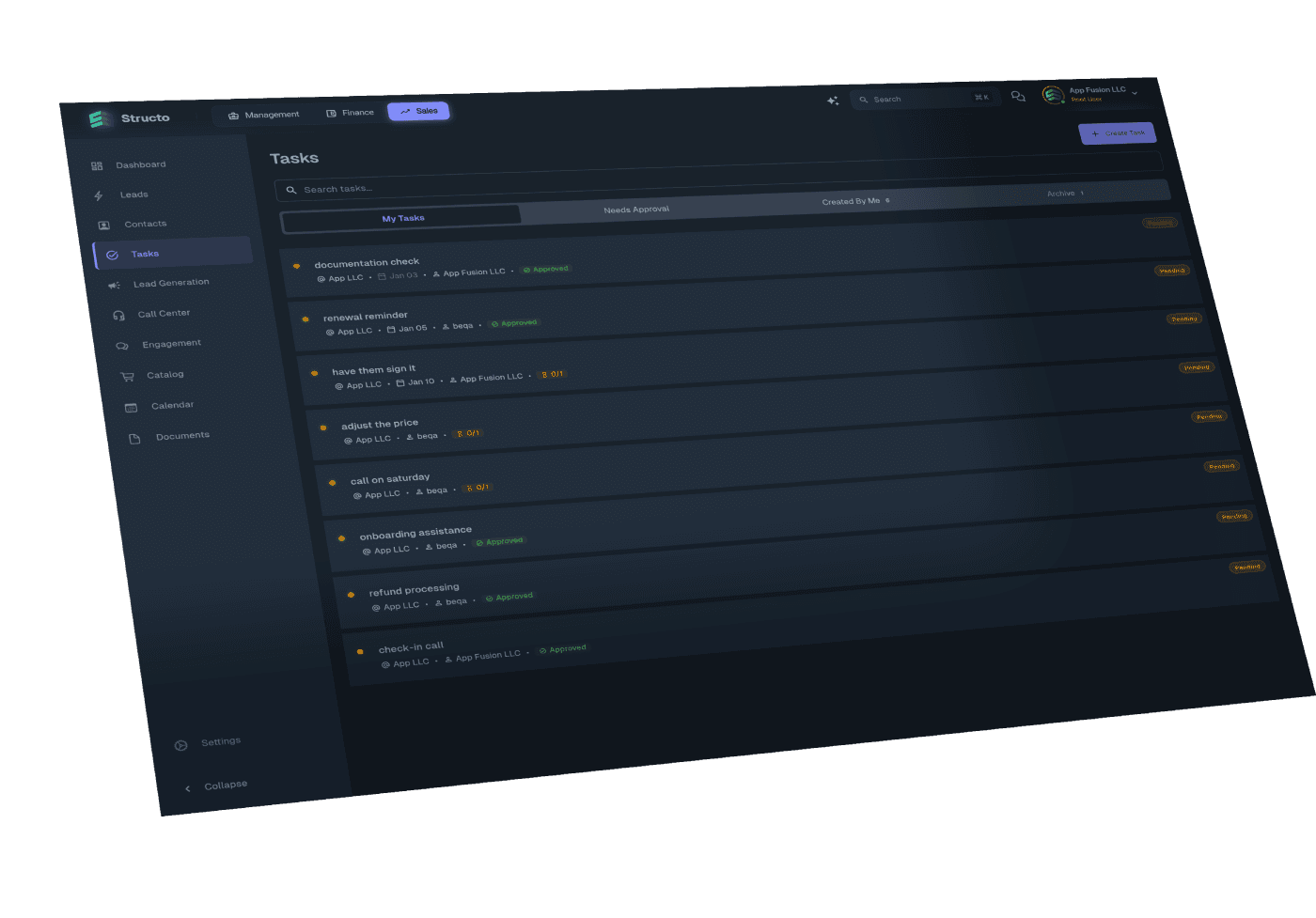 Stop chasing scattered emails and sticky notes. Structo’s task engine links every assignment directly to your clients, properties, and contracts, ensuring your team always knows what to do and who it’s for.